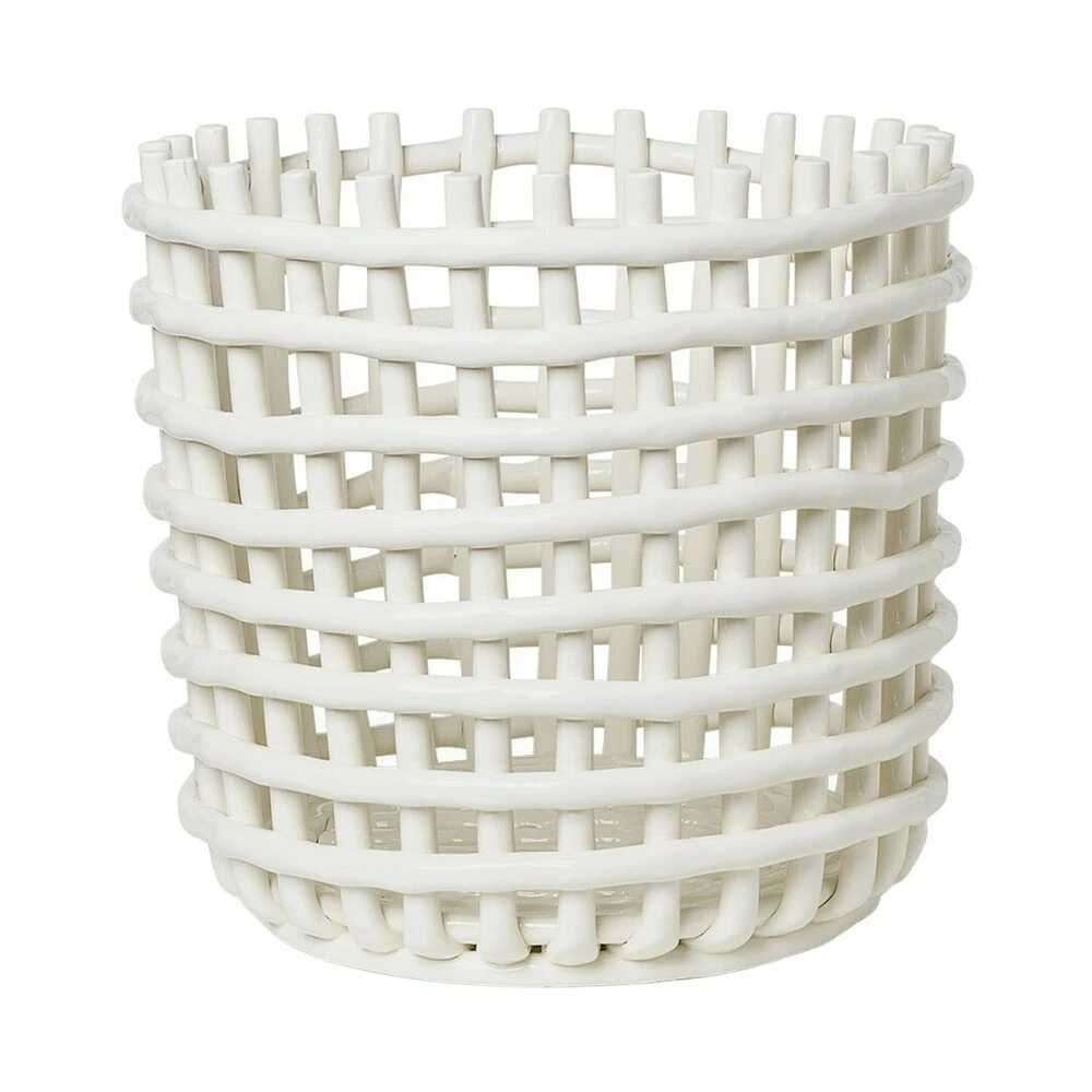 Våre håndlagde keramiske kurver tar med den tradisjonelle kurvveveteknikken til keramikk, og gjenskaper den kjente følelsen av vevde beholdere. Denne storslåtte, multifunksjonelle designen er ideell for oppbevaring av alt fra blomsterpotter til et ekstra teppe ved siden av sofaen. Skulptert for hånd og kunstferdig ujevne, ingen deler er like.Materiale: Glasert keramikkFarge: Offwhite Mål:Ø: 35 x H: 32 cmVedlikeholdsinstruksjoner:Tørk av med en fuktig klut